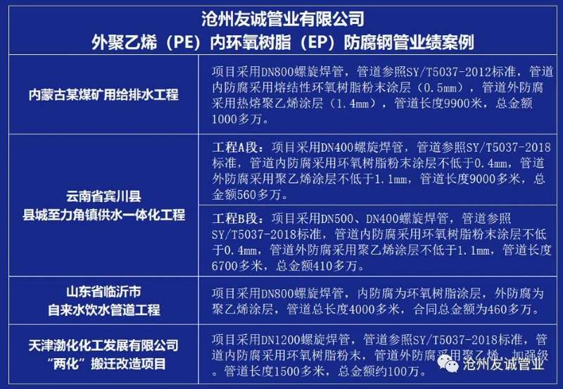 外聚乙烯內(nèi)環(huán)氧防腐鋼管,集合了聚乙烯和環(huán)氧樹脂的優(yōu)異防腐性能和抗沖擊耐磕碰性能于一身,可以耐酸、堿、鹽以及污水、土壤等環(huán)境侵蝕,適用于城市供排水管網(wǎng)、長輸管線輸送自來水、污水、中水和海水的管道工程。外聚乙烯內(nèi)環(huán)氧防腐方案已經(jīng)被市場證明是管道防腐的最佳防腐組合方案。